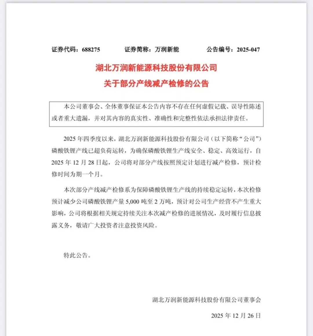 万润新能发布公告,2025年四季度以来,公司磷酸铁锂产线已超负荷运转,为确保磷酸铁锂生产线安全、稳定、高效运行,自2025年12月28日起,公司将对部分产线按照预定计划进行减产检修,预计检修时间为期一个月。本次部分产线减产检修系为保障磷酸铁锂生产线的持续稳定运转,本次检修预计减少公司磷酸铁锂产量5000吨至2万吨,预计对公司生产经营不产生重大影响。