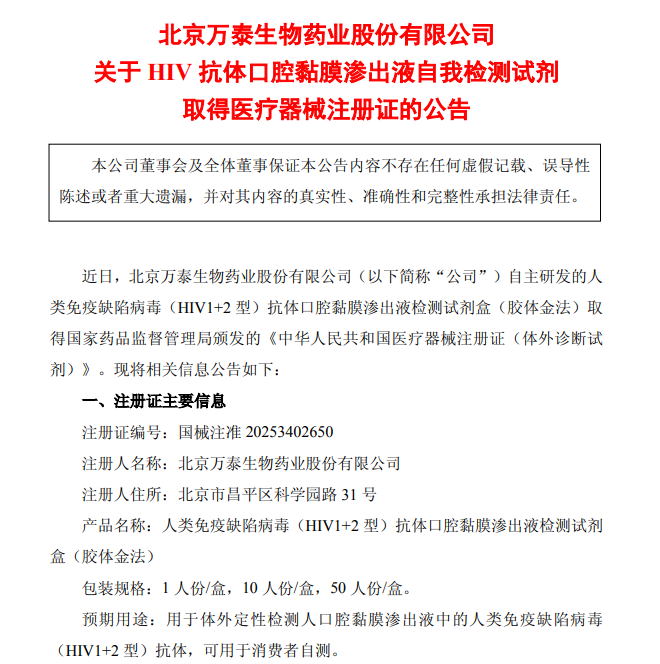 万泰生物HIV抗体口腔自测试剂取得医疗器械注册证