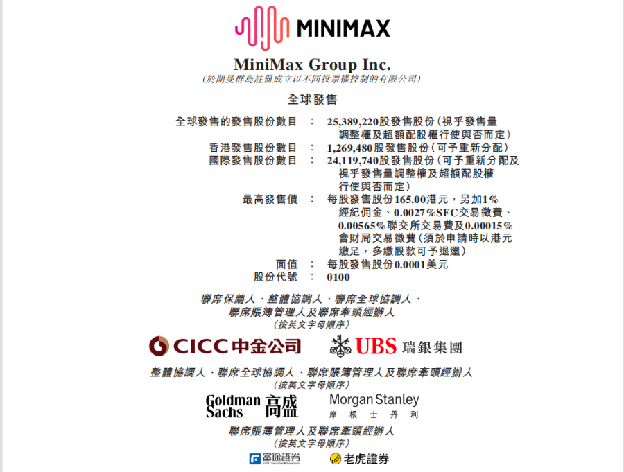 根据招股书,MiniMax本次IPO拟发行25,389,220股,定价区间为151至165港元/股,在不考虑发售量调整权及超额配股权行使的情况下,发行估值将介于461.23亿港元至503.99亿港元之间,预计将于1月9日正式登陆港股资本市场。