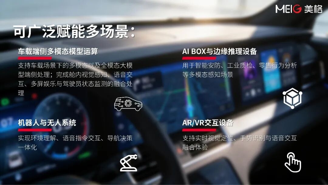车载多模态端侧大模型计算单元:支持车载场景下的多模态以及全模态大模型端侧处理;完成舱内视觉感知、语音交互、多屏娱乐与驾驶员状态监测的融合处理