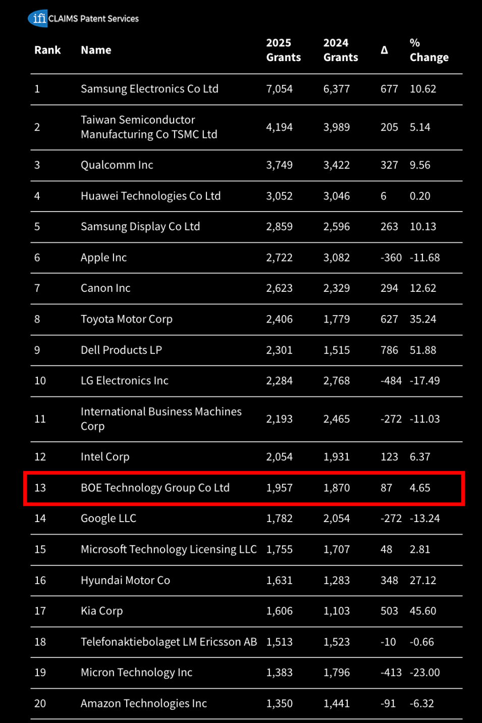 BOE(京东方)位列2025 IFI美国专利授权量全球第13位 以科技创新夯实全球产业领导力