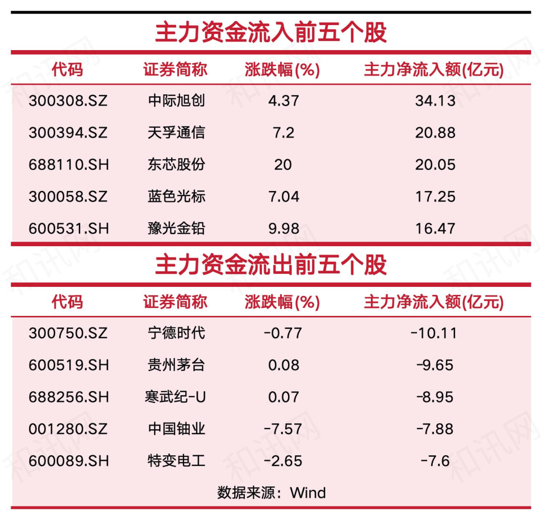 今日主力资金流入前五的个股主要集中在通信、电子和有色金属板块。其中,中际旭创(300308)以34.13亿元的主力资金净流入额位居首位,天孚通信(300394)和东芯股份紧随其后。主力资金流出前五的个股以权重股和前期热门赛道股为主,尽管部分个股仍维持小幅上涨,但资金撤离迹象明显。