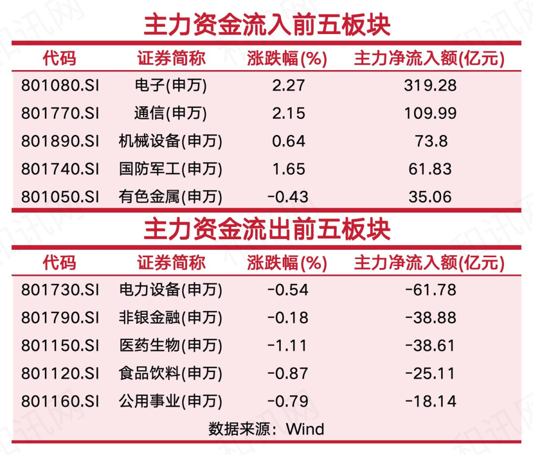 今日主力资金流入前五的板块集中在科技领域,电子板块以319.28亿元的净流入额遥遥领先,通信、机械设备等板块也获得显著加仓。主力资金流出前五的板块主要集中在电力设备、非银金融和医药生物等领域。
