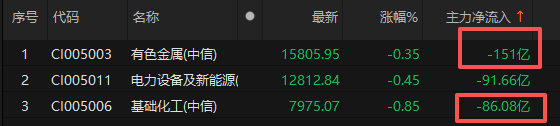 当天主力直接净流出151亿元,跟有色携手相伴的化工也没好到哪里去,遭主力资金净流出86亿。