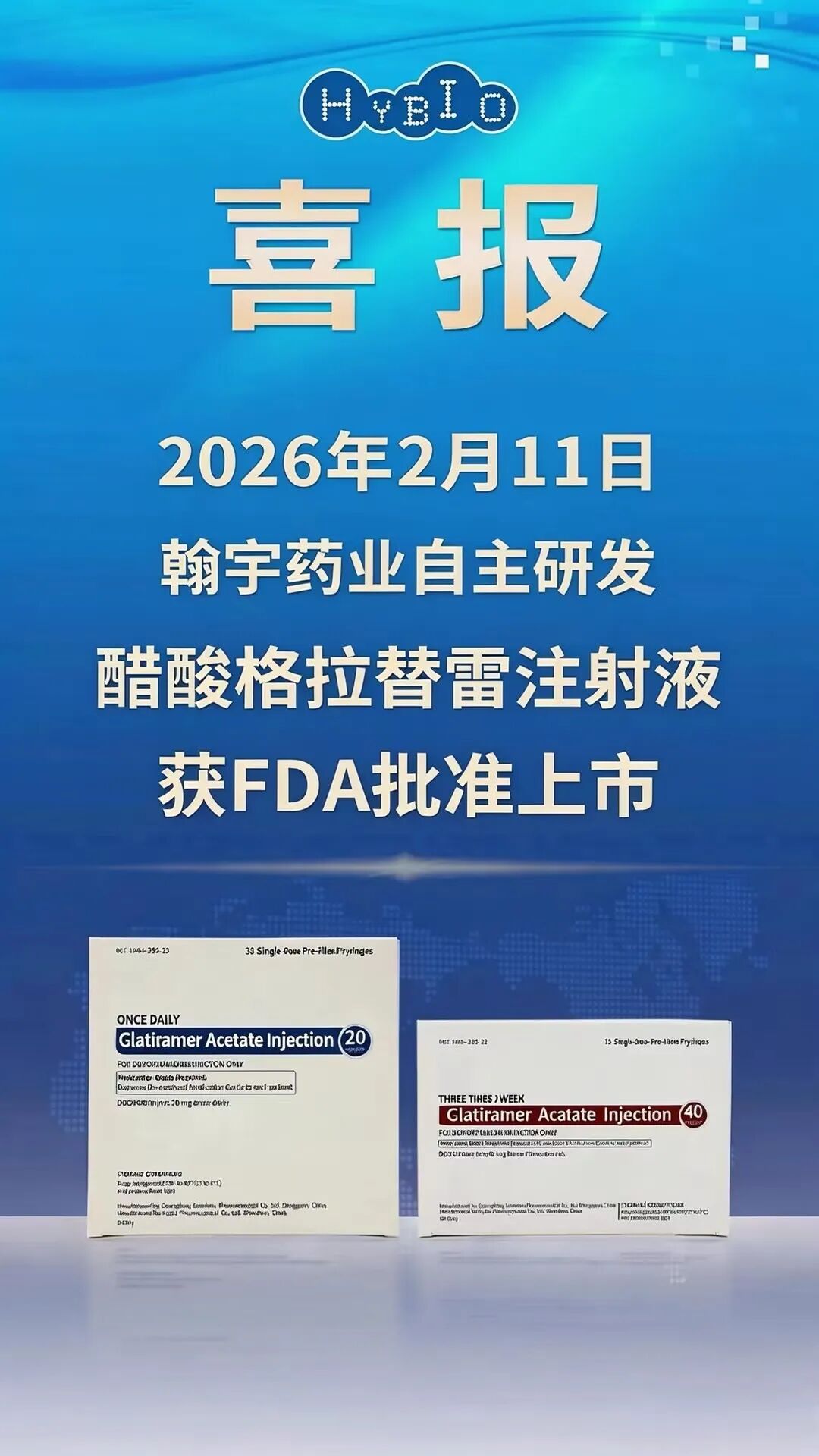 当地时间 2026 年 2 月 11 日,翰宇药业(300199)自主研发的醋酸格拉替雷注射液获美国食品药品监督管理局(FDA)上市批准,用于治疗多发性硬化症。这是公司继利拉鲁肽注射液首仿之后,又一款高难度复杂多肽药物成功登陆美国市场,标志着翰宇药业在多肽药物国际化战略中再夺关键性突破。