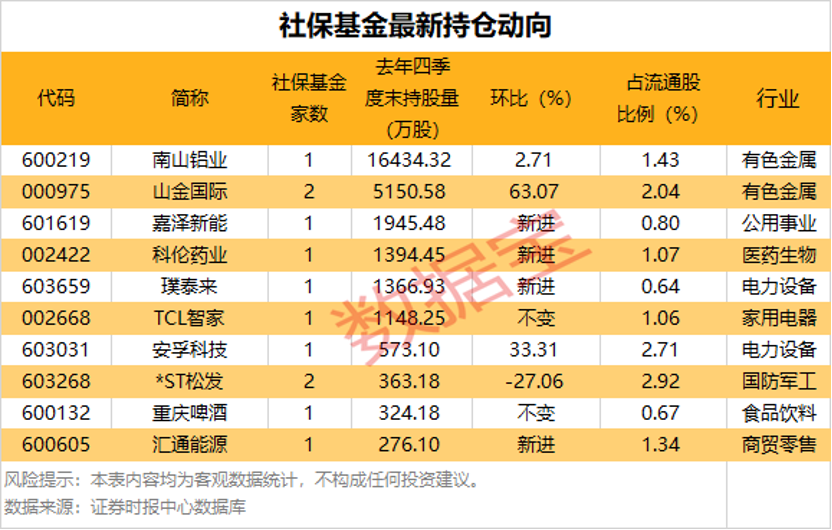 持股数量方面,社保基金持股量最多的是南山铝业(600219),共持有1.64亿股;山金国际(000975)嘉泽新能(601619)紧随其后,持股量分别为5150.58万股、1945.48万股。