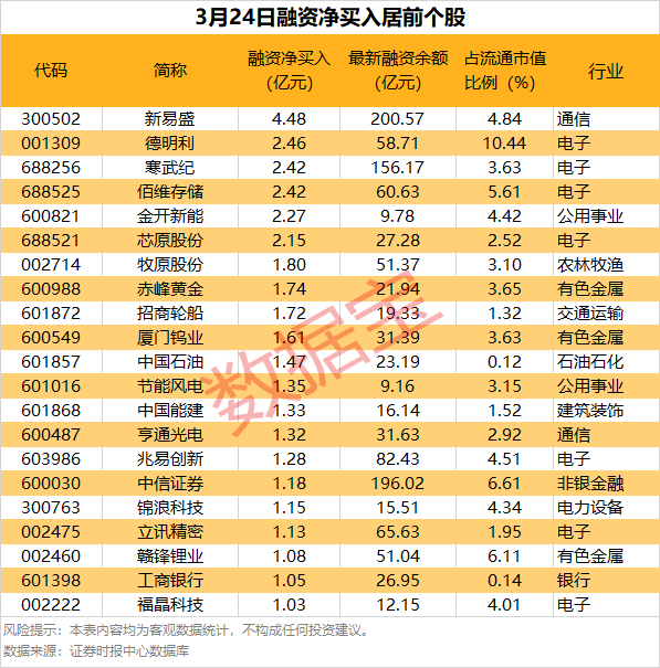 具体到个股,3月24日共有1670只股获融资净买入,净买入金额在千万元以上的有361只,其中21只融资净买入额超1亿元。新易盛(300502)融资净买入额居首,当日净买入4.48亿元;其次是德明利(001309)、寒武纪(688256),融资净买入金额分别为2.46亿元、2.42亿元;融资净买入金额居前的还有佰维存储(688525)、金开新能(600821)、芯原股份(688521)等。