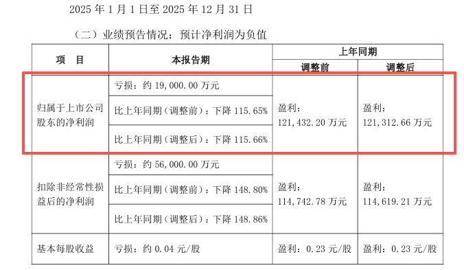 公司预计2025年度归母净利润亏损约1.9亿元,较上年同期的盈利12.13亿元(调整后)相比,下降115.66%,这也是公司首次出现亏损。