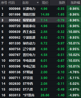 今日,全市场共20只个股跌停,其中近半数来自电力板块且证券简称中多包含能源(850101)、电力等字眼,如华电能源(600726)、长源电力(000966)、宁波能源(600982)、银星能源(000862)、辽宁能源(600758)等。这些个股走势大致相同,普遍为股价小幅低开并迅速下挫、触及跌停。