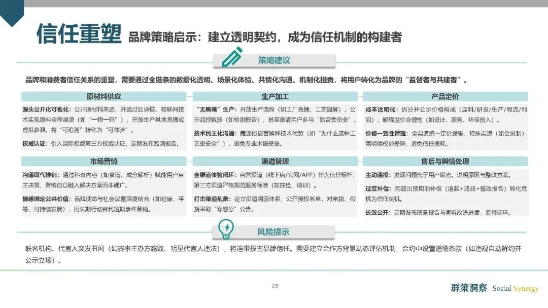 信任重塑:透明为底线,重建商业信任契约。《报告》强调,“全人消费(883434)”时代,品牌与消费(883434)者的关系已从“单向输出-被动接受”转变为“双向共建-相互监督”,透明不再是品牌的加分项,而是进入消费(883434)市场的基本门槛。品牌必须通过全链条的数据化透明、场景化体验、共情化沟通、机制化担责,构建全新的信任契约。