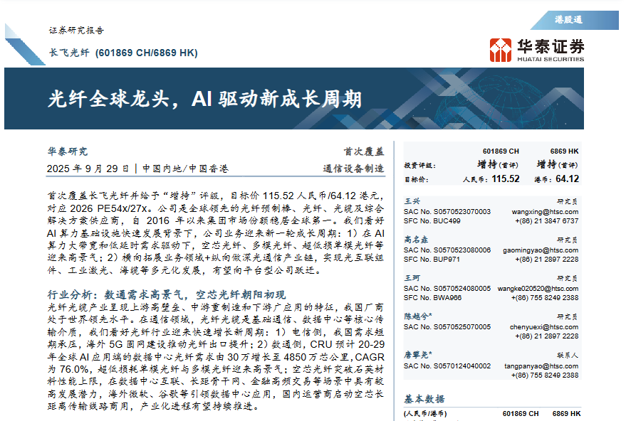 华泰证券(601688)分析师王兴、高名垚、王珂、陈越兮则在2025年9月发布研报《长飞光纤(601869)(601869):光纤全球龙头,AI驱动新成长周期(883436)》。研报首次覆盖长飞光纤(601869)并给予“增持”评级,目标价115.52人民币/64.12港元,对应2026 PE54x/27x。公司是全球领先的光纤预制棒、光纤、光缆及综合解决方案供应商,自2016年以来集团市场份额稳居全球第一。华泰证券(601688)看好AI算力基础设施快速发展背景下,公司业务迎来新一轮成长周期(883436):1)在AI算力大带宽和低延时需求驱动下,空芯光纤、多模光纤、超低损单模光纤等迎来高景气;2)横向拓展业务领域+纵向做深光通信产业链,实现光互联组件、工业激光、海缆等多元化发展,有望向平台型公司跃迁。2025年11月,华泰证券(601688)再次发布长飞光纤(601869)研报。