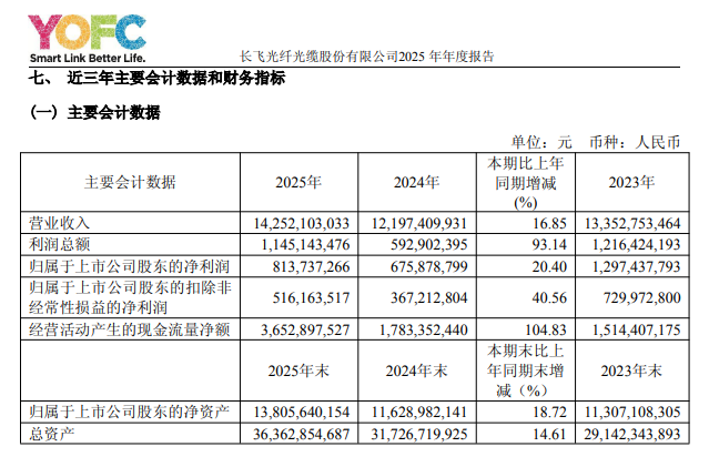 近日披露的2025年财报显示,长飞光纤(601869)2025年实现营收142.52亿元,同比上升16.85%;实现归母净利润8.14亿元,同比上升20.4%。