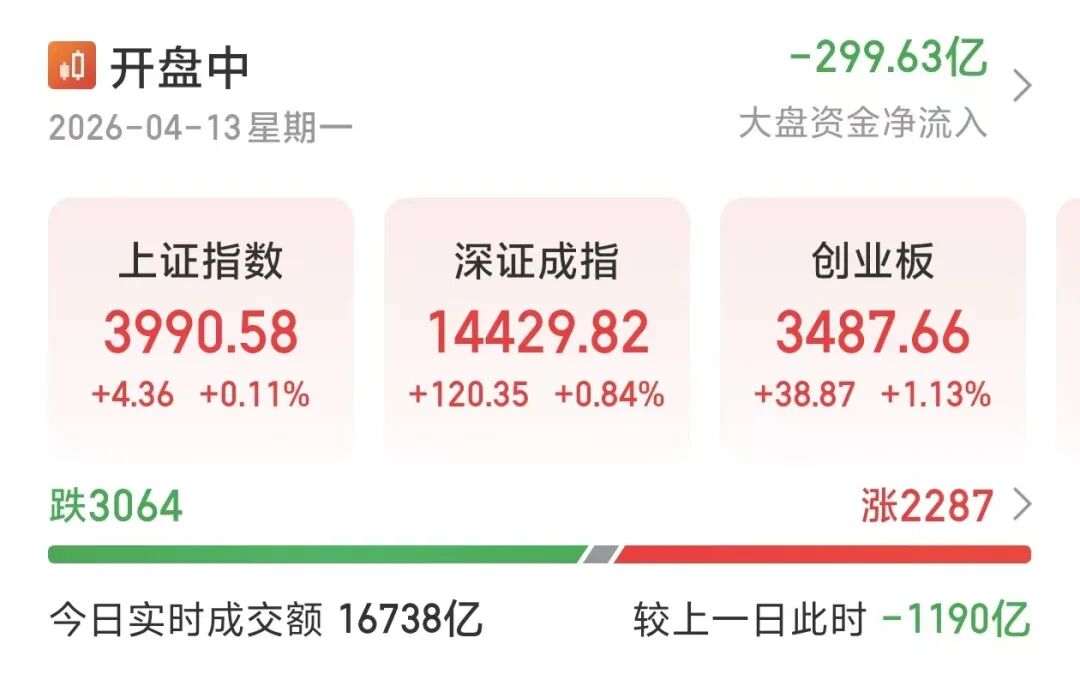 4月13日,A股三大指数午后全线翻红,沪指涨0.11%,报3990.58点;深证成指(399001)涨0.84%,报14429.82点;创业板涨1.13%,报13487.66点。全市场超2200只个股上涨。