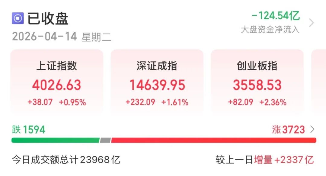 4月14日,A股三大指数集体上涨。截至收盘,上证指数(1A0001)涨0.95%,深证成指(399001)涨1.61%,创业板指(399006)涨2.36%,北证50涨1.17%。全市场成交额为23968亿元,较上一日增量2337亿元,全市场超3700只个股上涨。