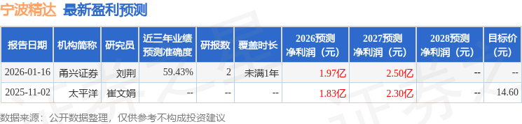 证券之星数据中心根据近三年发布的研报数据计算,甬兴证券刘荆研究员团队对该股研究较为深入,近三年预测准确度均值为59.43%,其预测2026年度归属净利润为盈利1.97亿,根据现价换算的预测PE为34.9。