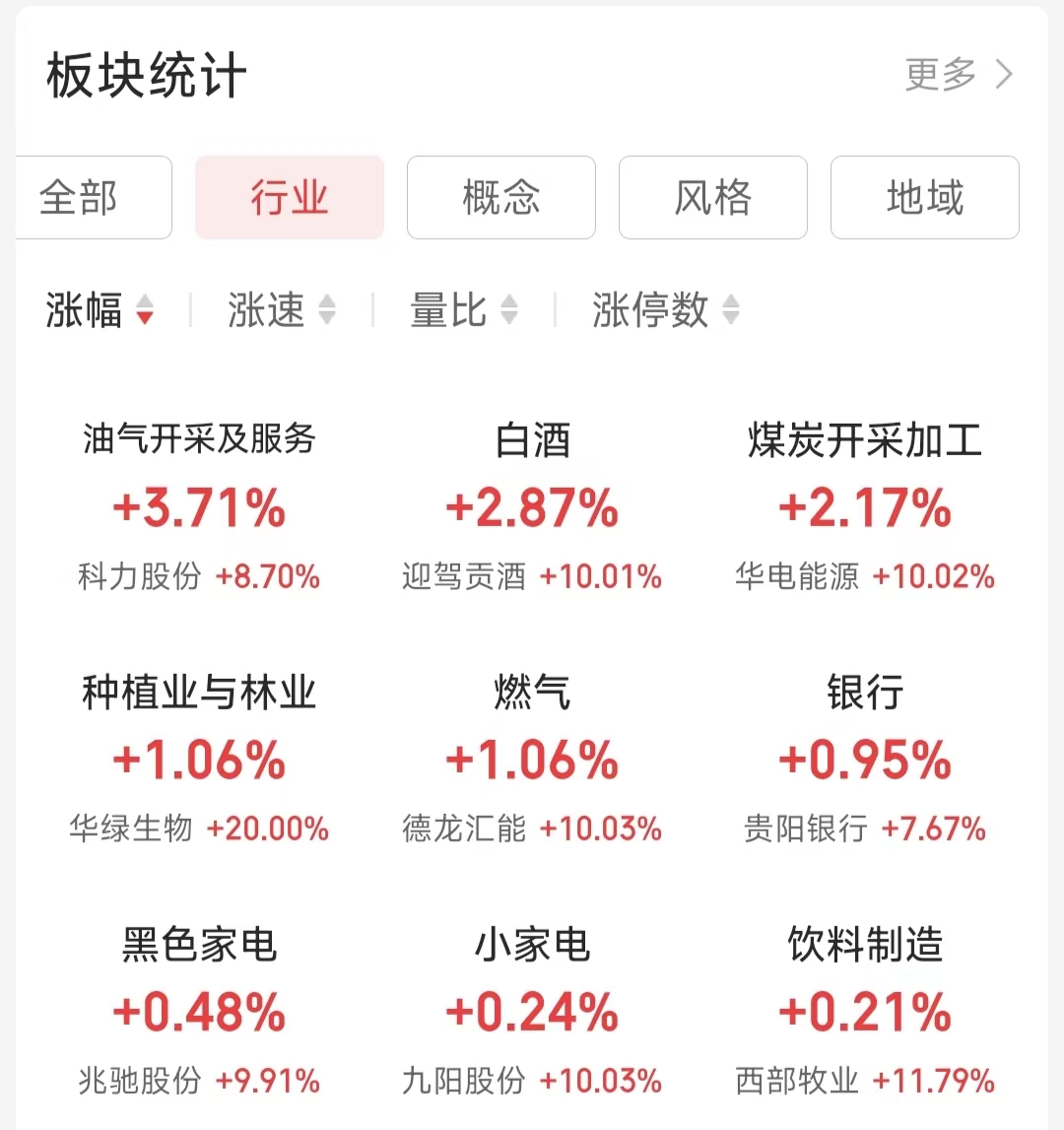 iFinD数据显示,截至4月23日上午收盘,在同花顺(300033)A股二级行业中,油气开采及服务(881107)行业涨幅达到3.71%,位居榜首。白酒(881273)(涨幅2.87%)、煤炭开采加工(881105)(涨幅2.17%)、种植业与林业(881101)(涨幅1.06%)、燃气(涨幅1.06%)等行业紧随其后。