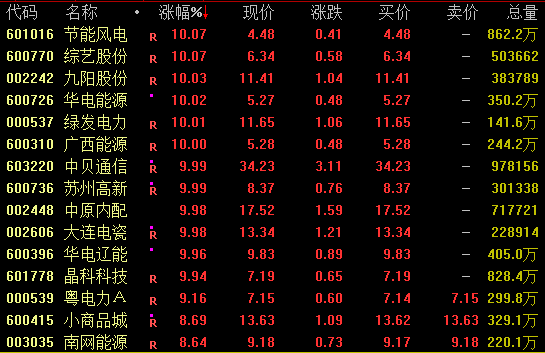 绿电概念盘中走势活跃,截至收盘,节能风电(601016)、华电能源(600726)、绿发电力(000537)、广西能源(600310)、华电辽能(600396)等十余股涨停。值得注意的是,华电辽能(600396)已连续3个交易日涨停。