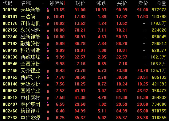 锂矿板块盘中走势活跃,截至收盘,天华新能(300390)涨近14%,永兴材料(002756)、盛新锂能(002240)、融捷股份(002192)、西藏珠峰(600338)等涨停;天齐锂业(HK9696)涨超8%,盘中一度触及涨停。
