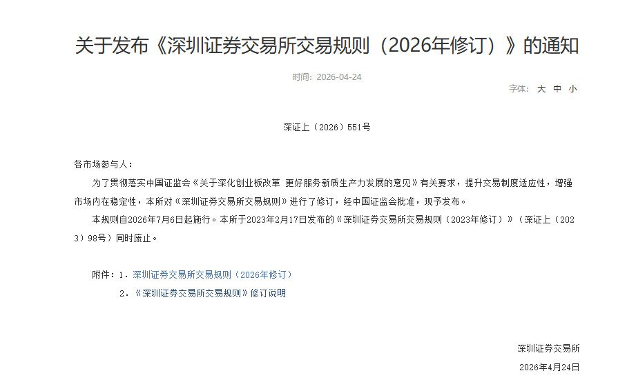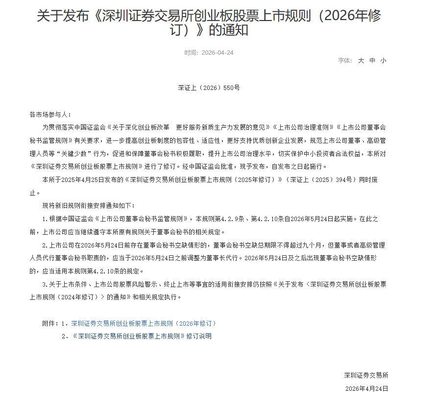 4月24日晚,深交所发布深化创业板改革首批配套业务规则,包括修订的创业板股票上市规则、交易规则、证券发行与承销业务实施细则,以及新制定的预先审阅指引。