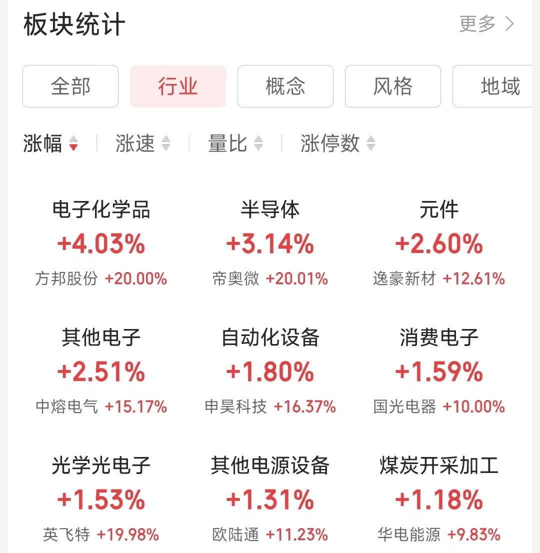 虽然大盘震荡,但结构性机会依然活跃,资金高效切换至科技主线。同花顺(300033)iFinD数据显示,截至4月27日上午收盘,在同花顺(300033)A股二级行业中,电子化学品(881172)行业涨幅达到4.03%,位居榜首。半导体(881121)(涨幅3.14%)、元件(881270)(涨幅2.60%)等行业紧随其后。