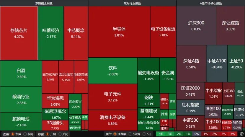 中芯概念、存储芯片(886042)、半导体(881121)、电子元件(881270)、消费电子(881124)设备、电子设备制造均大涨,饮料、白酒(881273)、麒麟电池、贵金属(881169)、磁悬浮概念、基础建设(884067)、钢铁(850106)收跌。