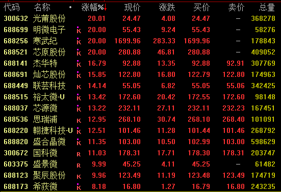 A股市场近2900股飘红,半导体(881121)、芯片概念(885756)爆发,寒武纪(688256)涨20%创历史新高(883911),股价逼近1700元/股,超越源杰科技(688498),成为A股“新股王”;芯原股份(688521)、明微电子(688699)等均涨停,华虹公司(688347)、龙芯中科等走高;商业航天(886078)概念拉升,日联科技(688531)连续两日涨停,翱捷科技(688220)、西测测试(301306)、陕西华达(301517)等涨超10%,金螳螂(002081)(002081)午后封涨停,近10个交易日斩获8个涨停板;机器人概念(885517)活跃,创世纪(300083)、光莆股份(300632)、凌云光(688400)等涨停。值得注意的是,工业富联(601138)再度下挫,收盘跌超5%,全日成交186.3亿元,位居A股成交额第二。此外,近一年大涨超10倍的长飞光纤(601869)盘中大幅跳水,收盘跌约4.5%。