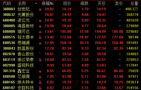 机器人概念(885517)盘中走势活跃,截至收盘,创世纪(300083)、光莆股份(300632)、凌云光(688400)、海昌新材(300885)等20%涨停,瑞可达(688800)、裕太微(688515)涨超13%,胜蓝股份(300843)再创新高。