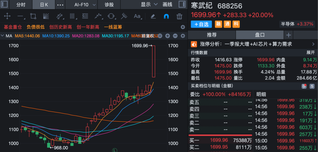科创板成为今日A股市场“最靓的仔”,寒武纪(688256)午后20%涨停,股价创历史新高(883911),并坐稳A股第一高价股“王位”,市值连续突破6000亿元、7000亿元大关,达7168亿元,超越海光信息(688041)成为科创板第二大市值公司。