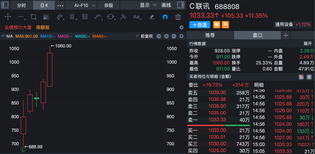 刚上市不久的次新股联讯仪器(688808)大涨逾11%,股价突破1000元。源杰科技(688498)也劲涨3.7%,每股股价一度突破1600元,再创历史新高(883911);从去年4月低点约96元/股,仅1年时间飙涨超15倍。
