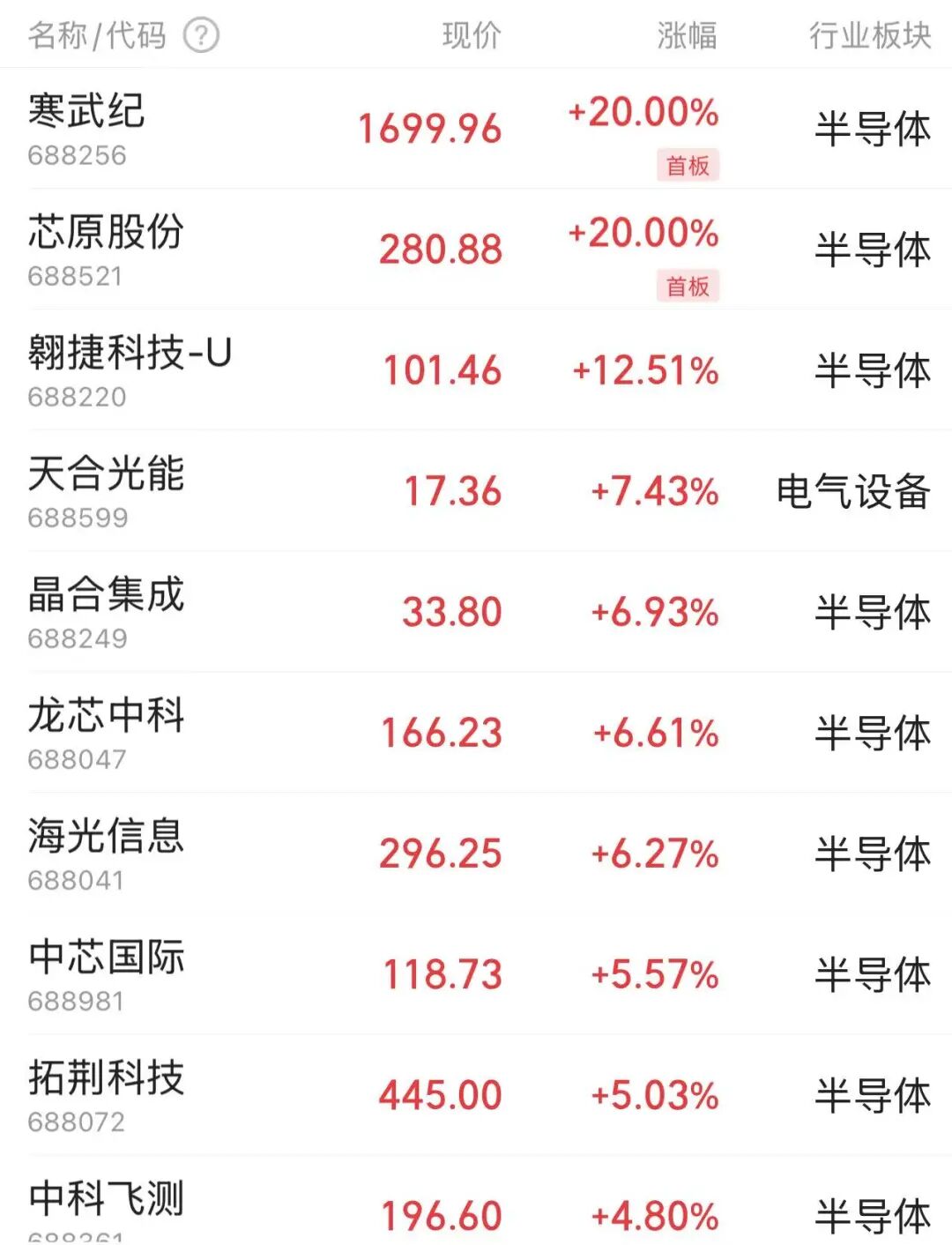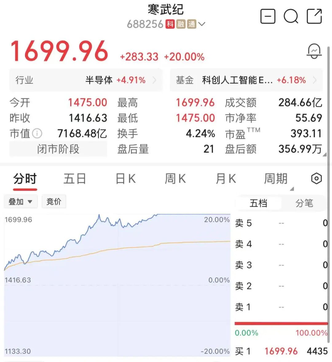 值得注意的是,寒武纪(688256)在今日涨停后股价来到了1699.96元/股,重新成为A股“股王”。