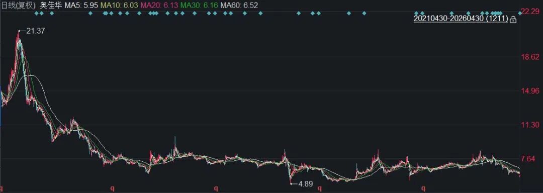 截至4月30日收盘,奥佳华(002614)股价报5.76元,年内已跌超21%,总市值35.93亿元。