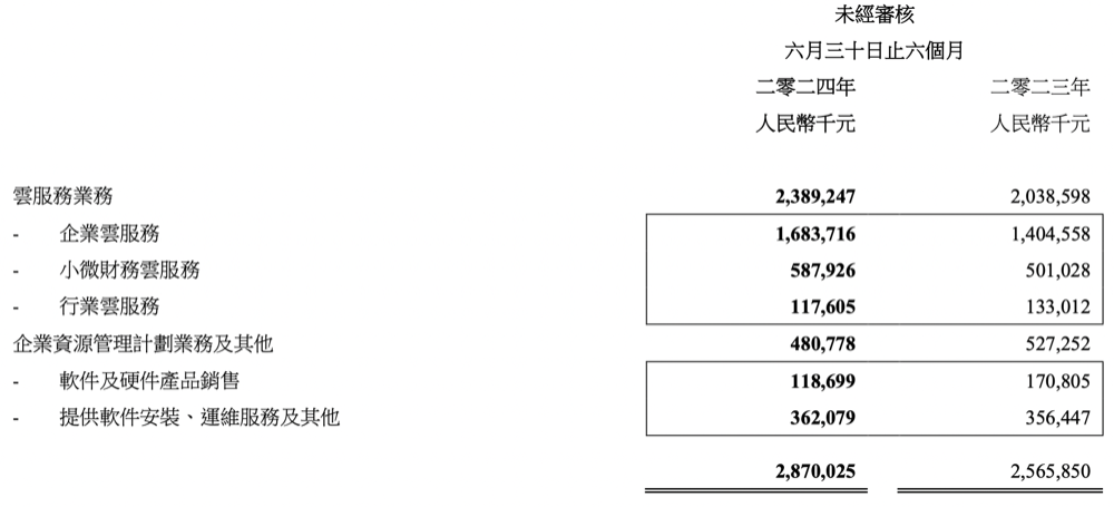 财报显示,金蝶整体收入来自两方面,其中云服务收入同比增长17.2%至23.9亿元,占集团收入的83.2%;企业资源管理计划业务及其他收入(主要为公司减少投入的业务类型)4.81亿元,同比下降约8.8%。
