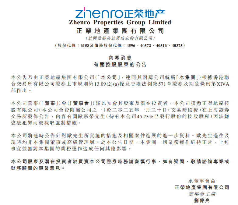 南财快讯记者注意到,这并非欧宗荣的首次危机。就在今年1月,正荣地产(06158.HK)发布公告称,控股股东欧宗荣因涉嫌违法犯罪而被采取强制措施。