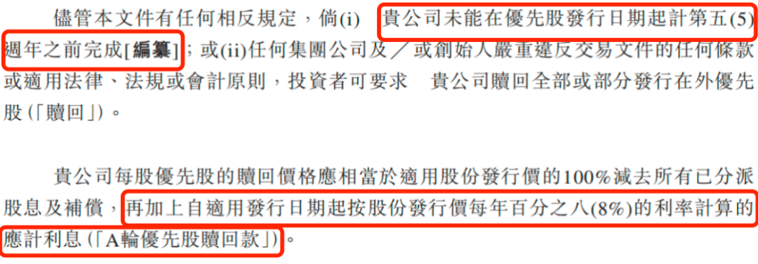 该笔投资内含对赌赎回条款,其提及一个时间点为“优先股发行日期起计第五周年”,即2026年。若双方约定的条款没有完成,投资者可以要求卡游赎回全部或部分发行在外的优先股,而每股优先股的赎回价格将再加上自适用发行日期起按股份发行价每年8%的利率计算的应计利息。
