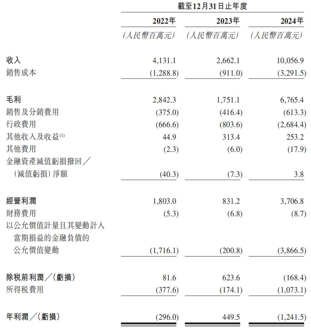 净利润方面,2022年、2023年和2024年分别实现净利润-2.96亿元、4.50亿元和-12.42亿元。从财务报表可以看到,公司2024年以公允价值计量且其变动计入当期损益的金融负债的公允价值变动高达38.67亿元,主要是A轮优先股的价值变动,直接导致公司从盈利变成亏损。公司还称,2024年行政费用增加,主要是根据股权激励计划向李奇斌授出的若干股份确认股份支付开支。