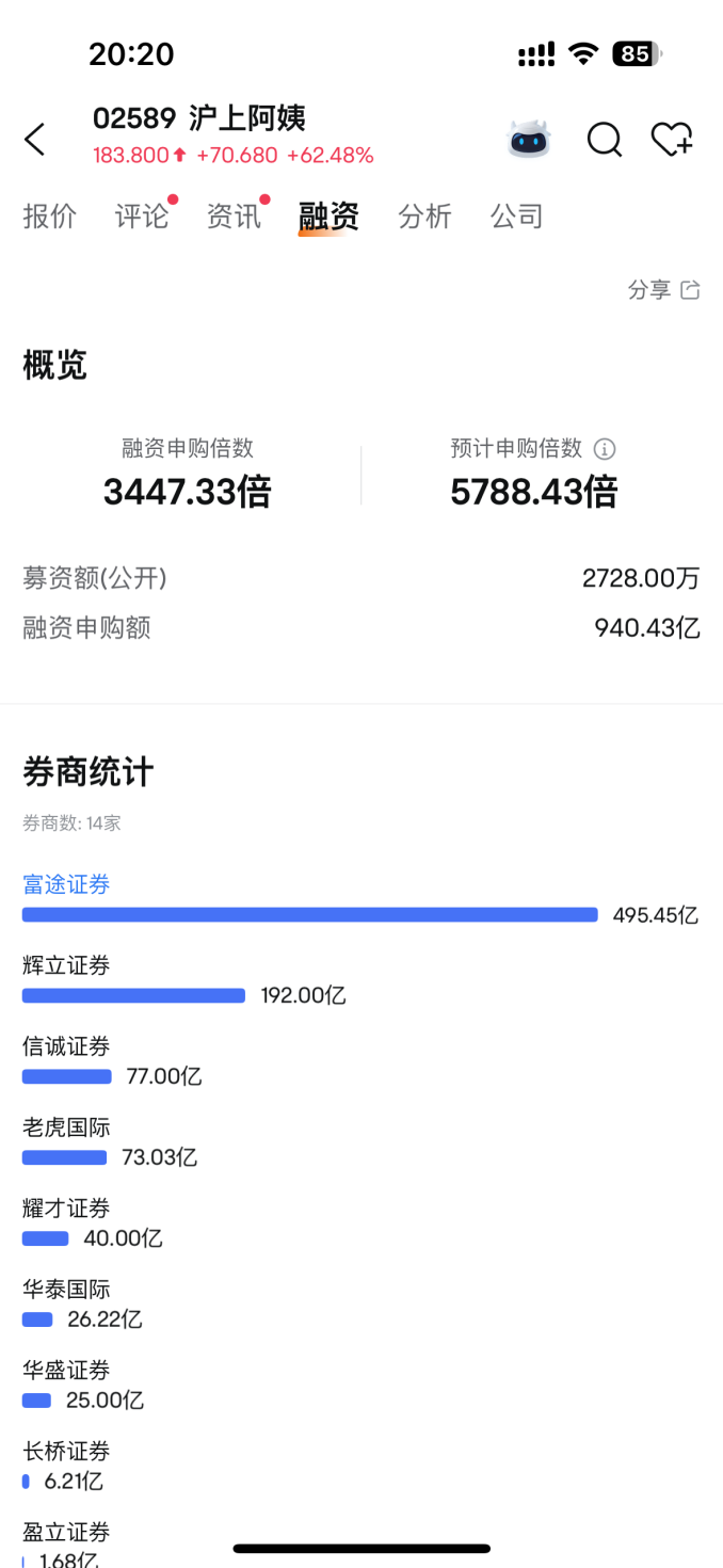 沪上阿姨的这一市场表现并不让人意外。在沪上阿姨上市前夜,其暗盘涨幅就已超过60%,富途牛牛还显示,其融资申购倍数达到3447.33倍,融资申购额超过940亿港元。