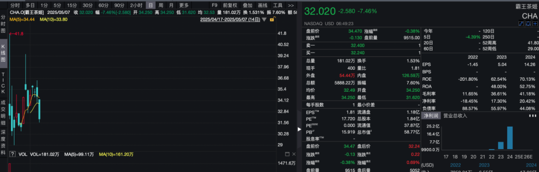 而在美股上市的霸王茶姬,股价表现同样不理想。