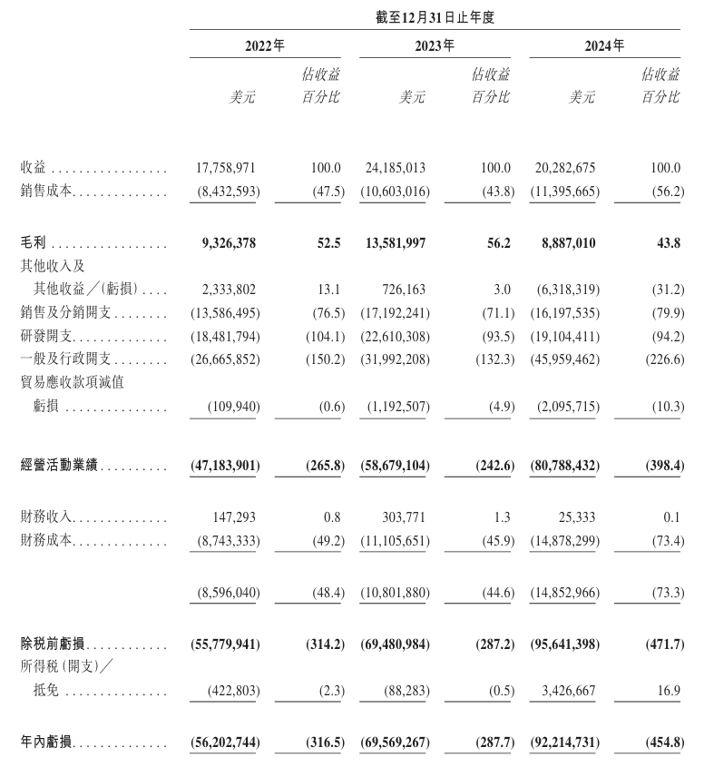 然而,尽管营业收入和研发投入均有所增长,觅瑞公司在这三年中却连续遭遇了亏损。具体来看,2022年的净亏损为5620.27万美元,到了2023年这一数字上升至6956.93万美元,而到了2024年,净亏损进一步扩大至9221.47万美元。
