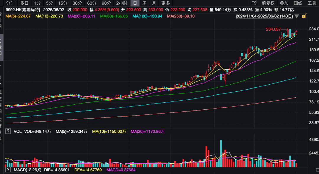 泡泡玛特上涨4.36%,报230港元,接近近期创下的历史新高。