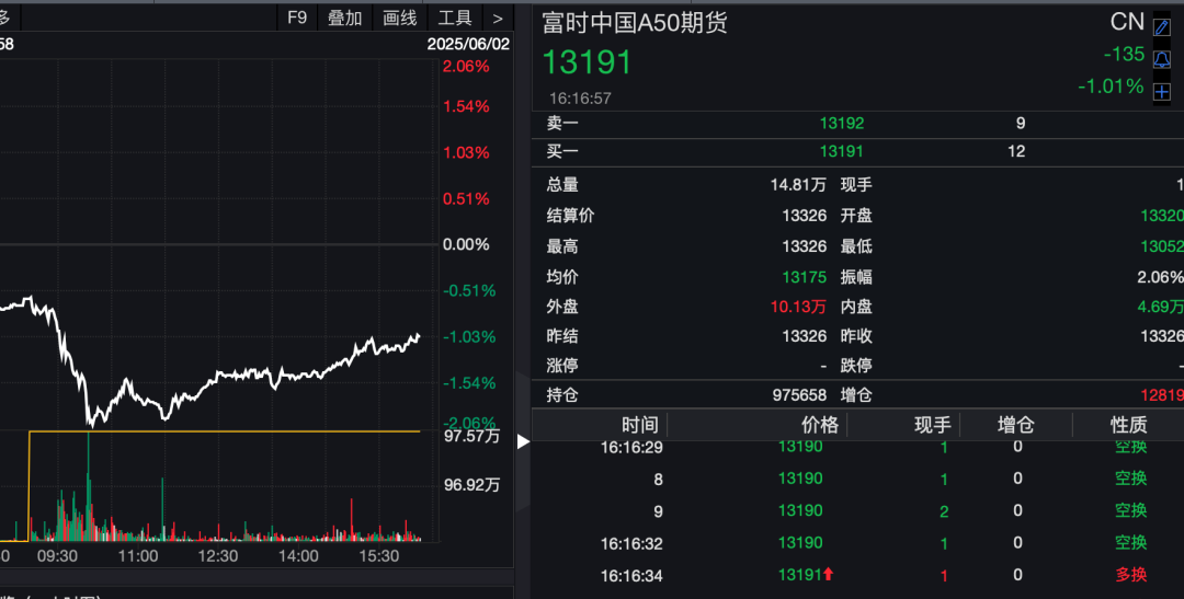 富时中国A50期货盘中跌超2%,截至发稿时的跌幅为1.01%。