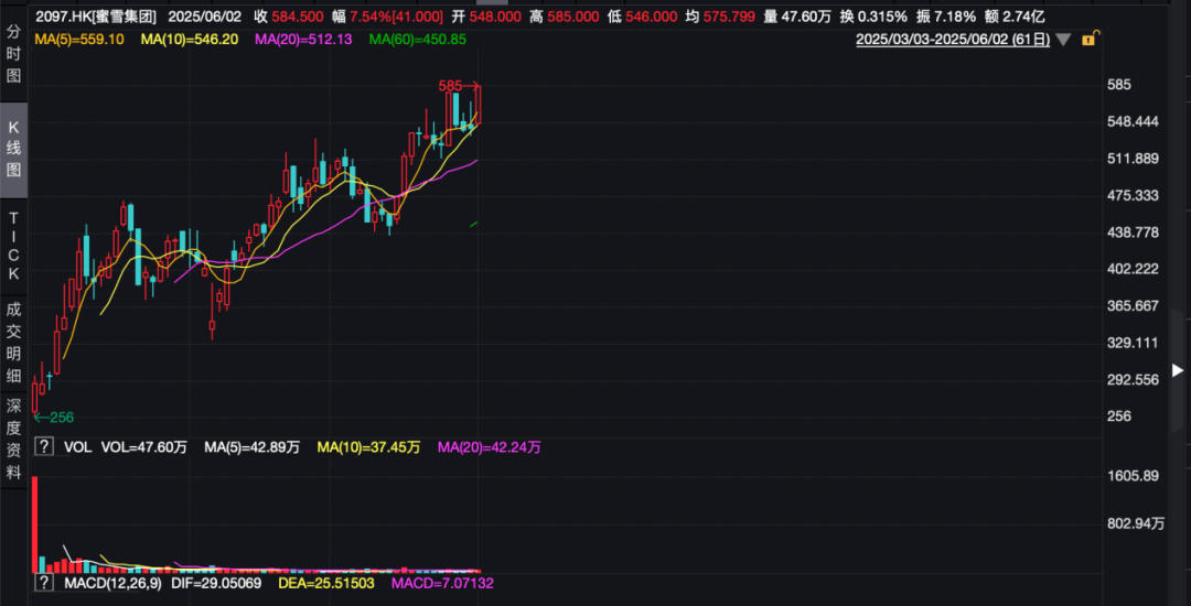 新消费股持续受资金追捧,蜜雪集团今日上涨7.54%,报584.50港元,创上市以来新高。