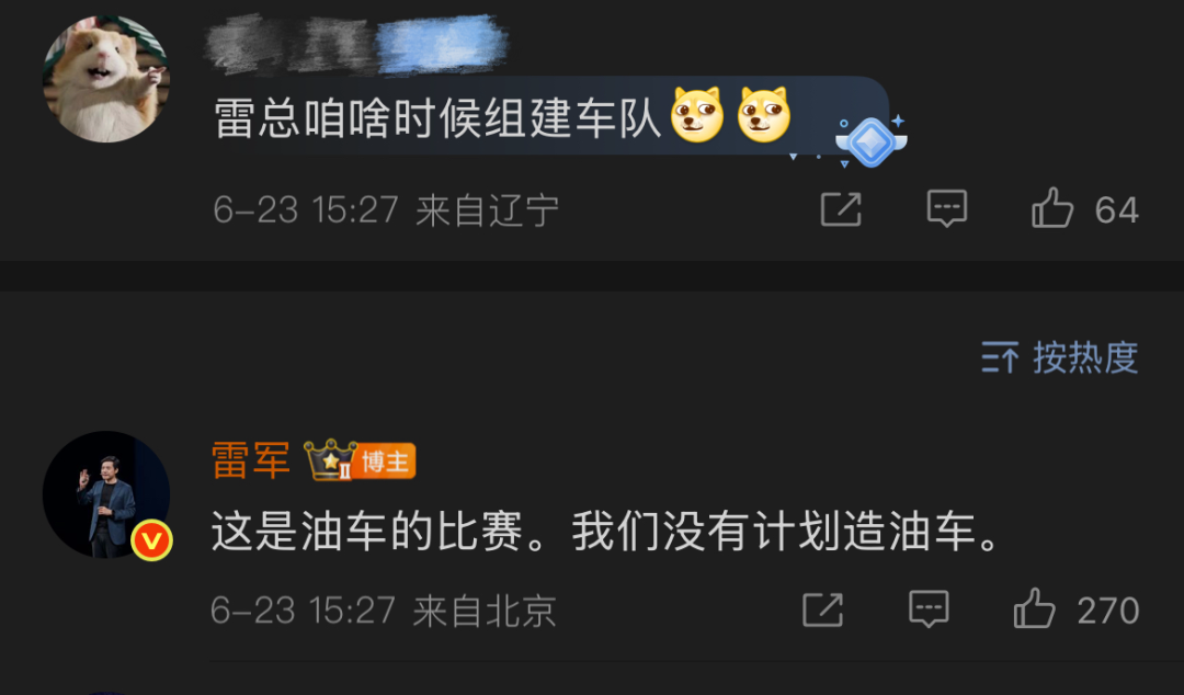 在评论区,有用户向雷军询问:“雷总,咱啥时候组建车队?”