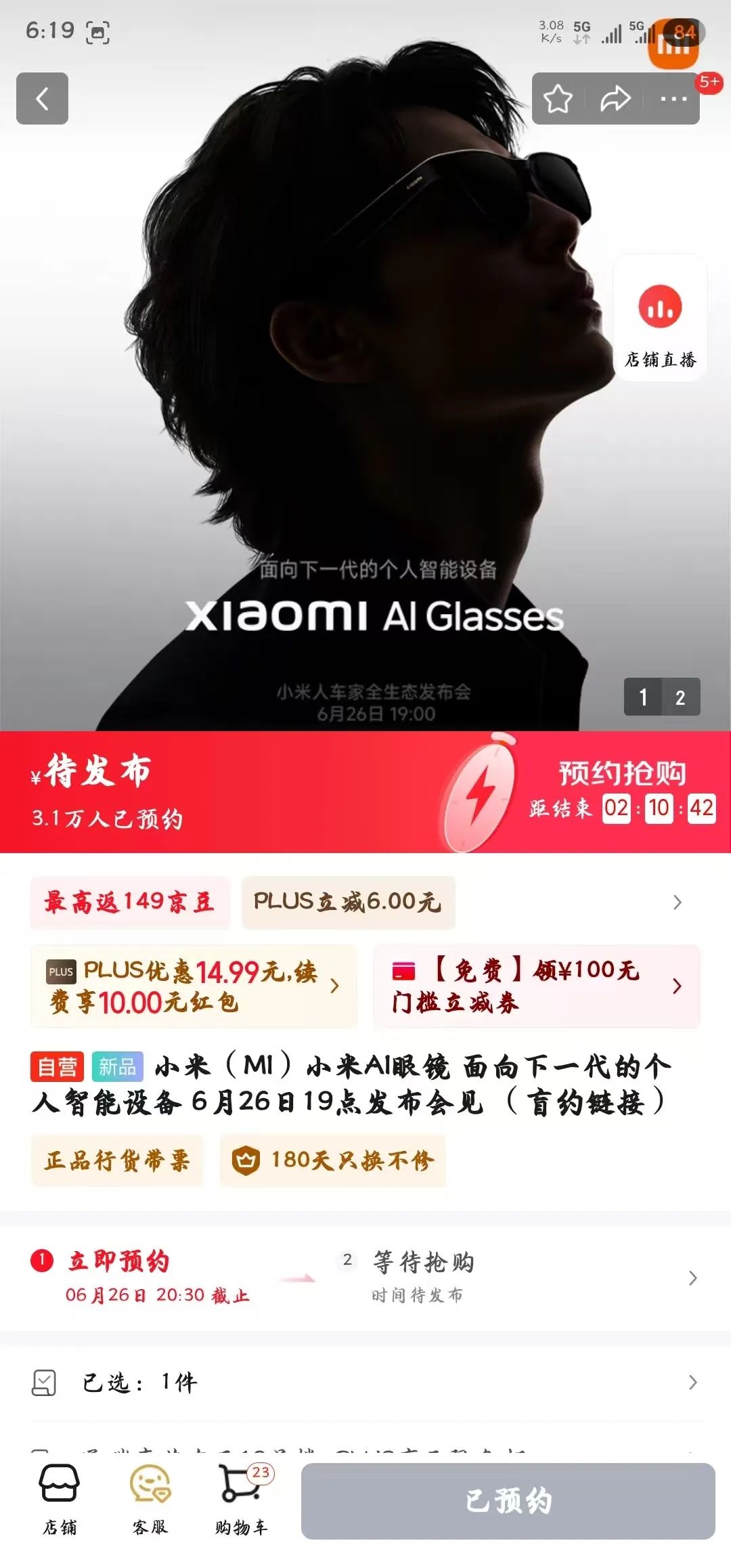 发布会前一晚,小米AI智能眼镜在京东自营店上线了“盲约”(无售价)链接,预约将在发布会前停止。截至发布会前,超3万人参与了此次发布会前的“盲约”。