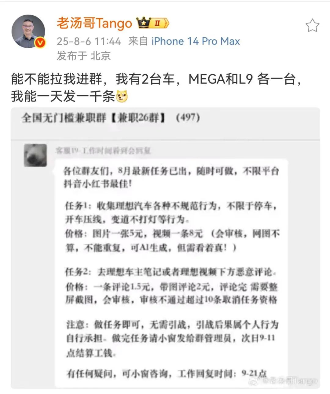 8月6日,理想汽车产品负责人汤靖晒出一张网络水军组织抹黑理想汽车的兼职群聊天截图,显示需要兼职人员通过两个任务抹黑理想汽车及其车主。