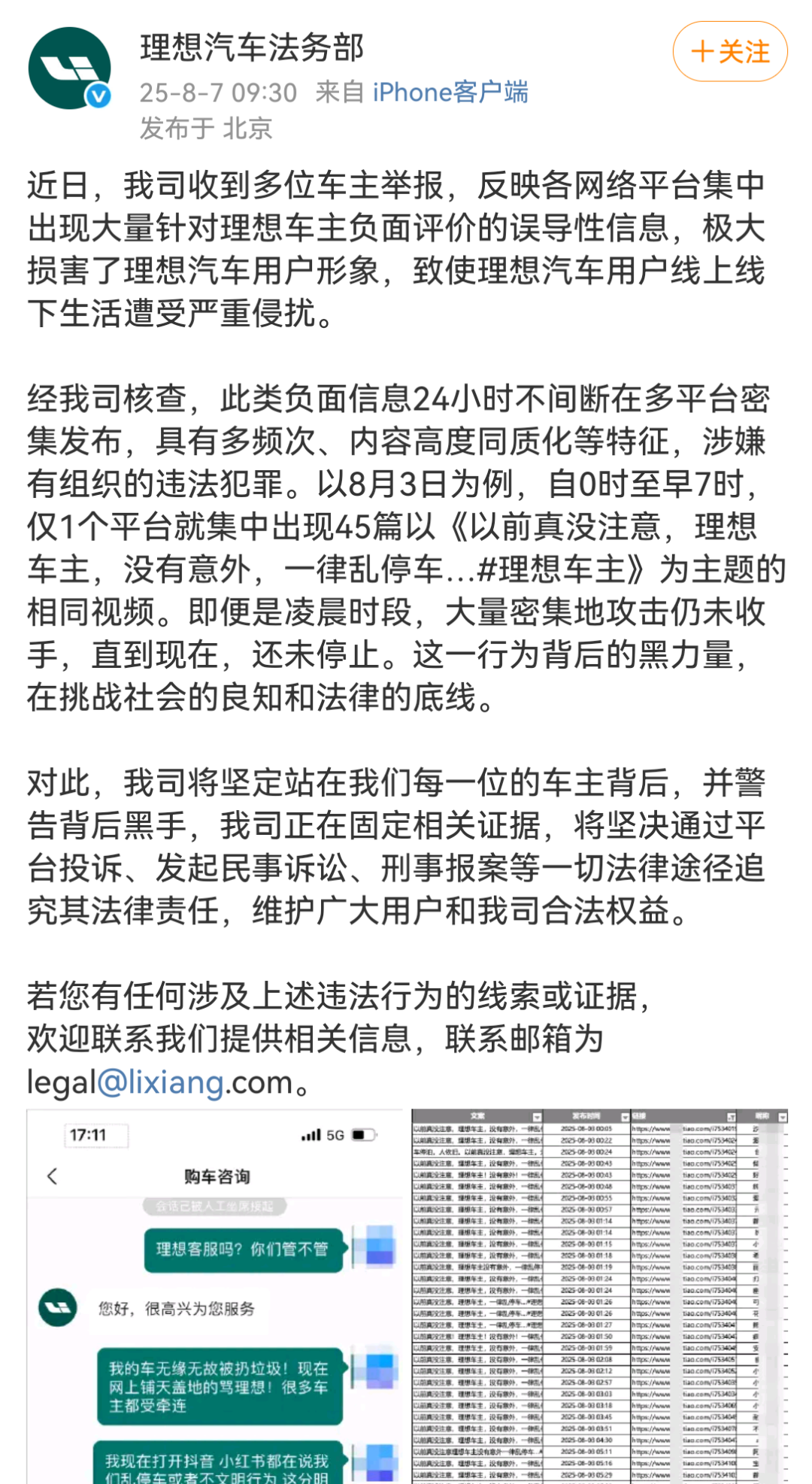 “我们现在出门都感觉提心吊胆的,你们现在有什么措施吗?”8月7日,理想汽车法务部发布微博称,公司近日收到多位车主举报,反映在各网络平台集中出现大量针对理想汽车车主负面评价的误导性信息。