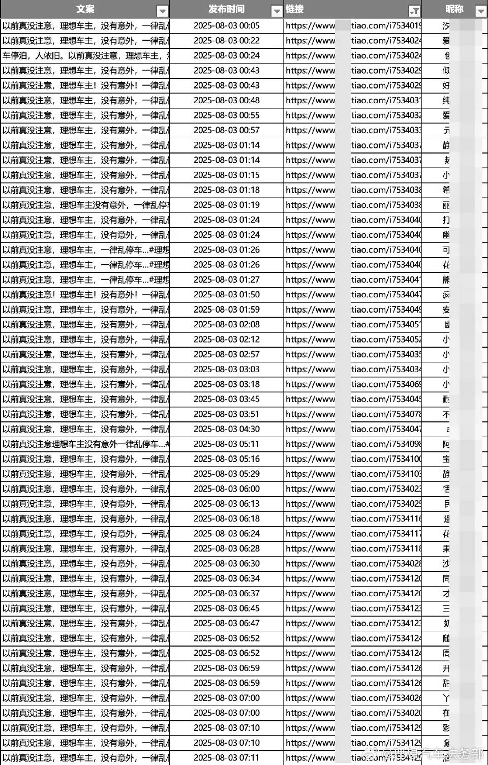 以8月3日为例,自0时至早7时,仅在1个平台集中出现45篇以《以前真没注意,理想车主,没有意外,一律乱停车……#理想车主》为主题的相同视频。