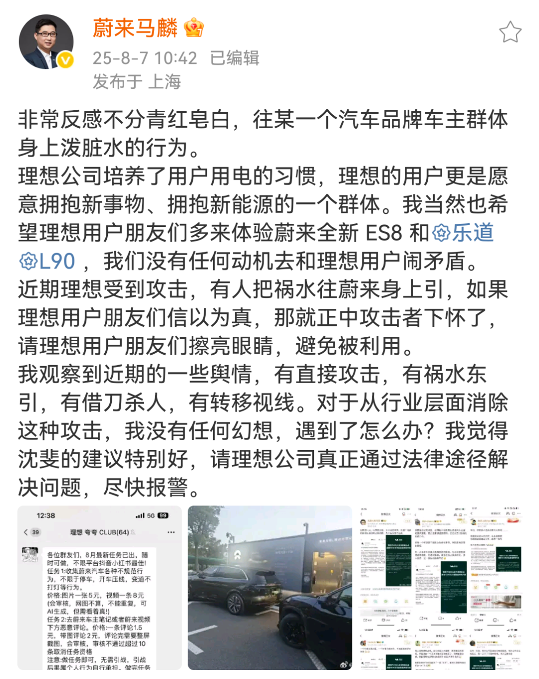 8月7日,蔚来助理副总裁,品牌、传播与营销负责人马麟发布微博称:“非常反感不分青红皂白,往某一个汽车品牌车主群体身上泼脏水的行为。”
