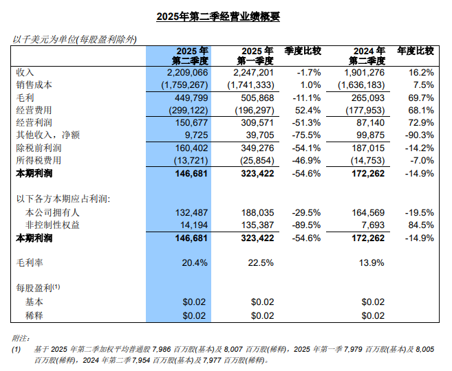 8月7日,中芯国际发布公告称,二季度实现销售收入22.09亿美元,环比下降1.7%,同比增长16.2%。二季度毛利为4.5亿美元,环比下降11.1%,同比增长69.7%。二季度毛利率为20.4%,环比下降2.1个百分点,同比增长6.5个百分点。二季度产能利用率92.5%,环比增长2.9个百分点。