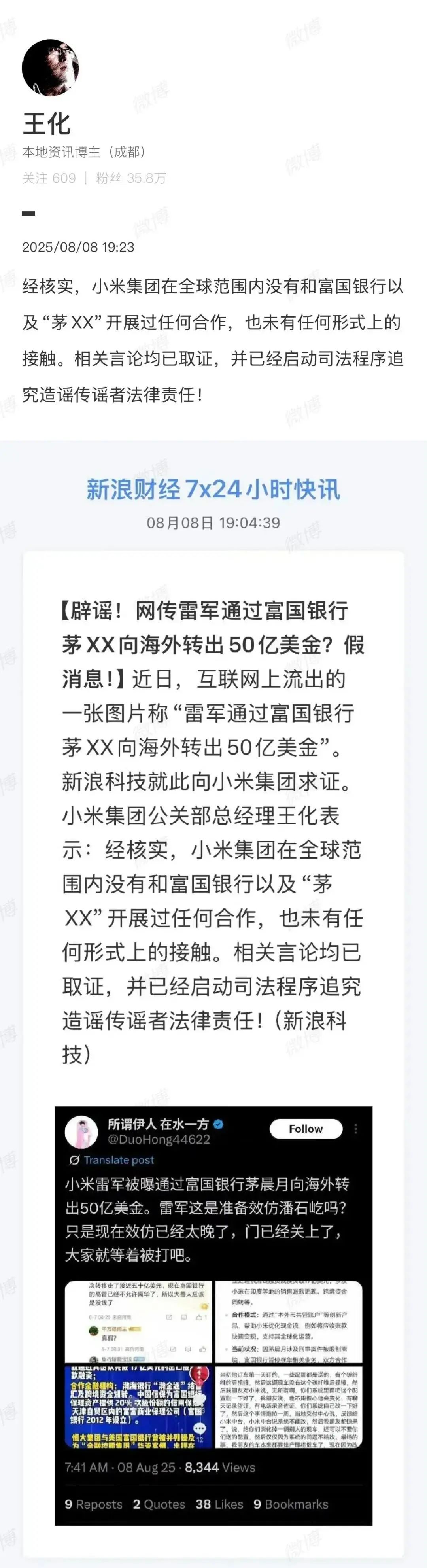 8月8日,小米集团公关部总经理王化辟谣网传“雷军通过富国银行茅XX向海外转出50亿美金”。