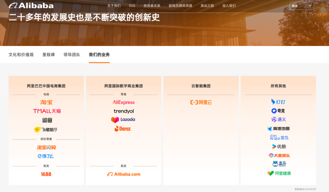 8月22日,阿里巴巴官网“我们的业务”板块变更,将业务重新划分为四大部门:阿里巴巴中国电商集团、阿里国际数字商业集团、云智能集团以及“所有其他”业务。